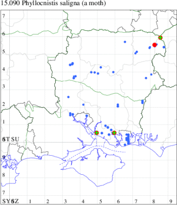 Local in fens, marshes, river-banks and other damp areas throughout southern England. In Hampshire known only from a handful of sites, including Fleet, Greywell Moors, Southsea and Leckford, but perhaps under-recorded. Not recorded from the Isle of Wight to date. Wingspan 6-7 mm. The imago can be separated from other Phyllocnistis only by dissection of the genitalia (females only, males are indistinguishable). Larva mines leaves of Purple Willow Salix purpurea. See the leafmines.co.uk newsletter that describes the mines of the four species in the complex.