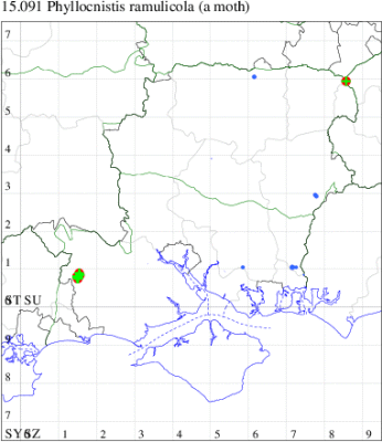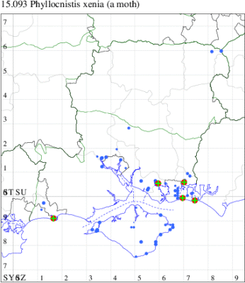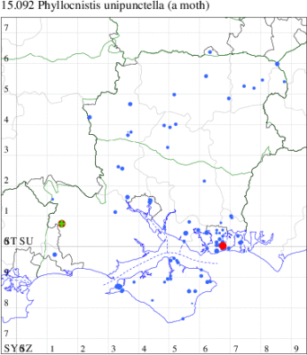 Nationally scarce (Na) in damp woodland in southern England. First discovered in 2006 as new to science in Havant Thicket, Hampshire, subsequently found more widely in Hampshire and adjacent counties. In 2007, found to be widespread, and hence likely to have been a long-term, previously undiscovered resident. Not recorded from the Isle of Wight to date. Wingspan 6-7 mm. The imago can be separated from other Phyllocnistis only by dissection of the genitalia (females only, males are indistinguishable). Larva mines the stem of various willow Salix sp. See the leafmines.co.uk newsletter that describes the mines of the four species in the complex.