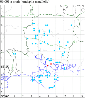Local in woodland, and on downland and scrubland throughout southern England, north to Yorkshire. In Hampshire and on the Isle of Wight not uncommon where the foodplant grows, recorded mostly as vacated mines and leaf cut-outs. Wingspan 6 mm. May be separated from the other Cornus feeding Antispila A. metallella by its smaller size, darker and less coppery ground colour, the shape of the pre-apical spot, the colour pattern of the terminal cilia and the paler and less purple hindwings (MBGBI Vol 1). Larva mines leaves of Dogwood, subsequently living within a movable case, and over-wintering as a pupa. The mines are described in the following link:
