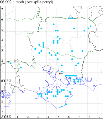 Local in woodland, and on downland and scrubland throughout much of England. In Hampshire and on the Isle of Wight reasonably common and well-distributed on the chalk. Wingspan 7.5-8.5 mm. Adults are day-flying, but the species is more frequently recorded in the larval stage, mining the leaves of Dogwood Cornus sanguinea. The mine starts as a short gallery along leaf edge, abruptly changing to a blotch, finally the larva cuts out an oval hole 5.5 to 7mm along the longer axis. Before the egg is laid the female makes several ‘practice’ slits, which helps to separate this from Antispila petryi.
