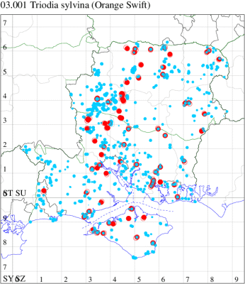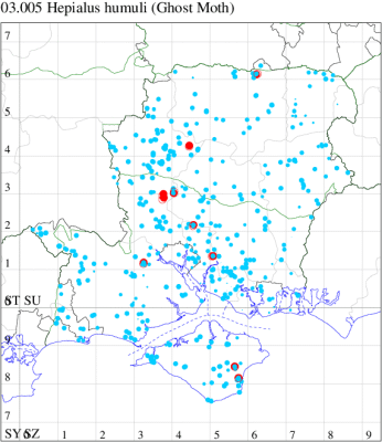 For the maps, all records prior to 2020 are shown by a blue dot (the larger the dot, the more recent), with the current year's records shown in red. As previous records are superimposed on any report for 2020, new sites have greater emphasis (i.e. will show as 'more red').