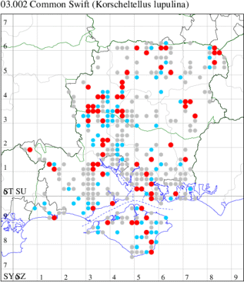 VC12: Chilbolton, one, 02 Jul (CMap); Bulpits Hill, Vernham Dean, one, 13 Jul (JHal); Littleton, one, 23 Jul; one, 23 Jul; Hurstbourne Priors, one, 23 Jun (GCE); North Waltham, one, 27 Jun (AJon); Noar Hill HIWWT NR, Selborne, one, 08 Jul (IBla); Selborne, two, 11 Jun; Empshott, one, 06 Jul (CJP); Fleet Pond, one, field observation, at dusk, 18 Jul (MHals)