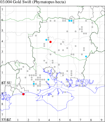VC12: Earliest: Hurstbourne Priors, 30 Apr, 1 (GCE) Latest: Pamber Forest, 23 Jun, 1 (GJD) Max count: Longparish, 09 Jun, 31 (GCE)