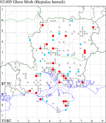 Common in rough meadows and grassland throughout much of Britain and Ireland, but excluding the Isles of Scilly, a species of conservation concern under the UK Biodiversity Action Plan. Widespread in Hampshire and on the Isle of Wight but local and declining. The males have leks in grassy places on downland and in meadows where they fly in numbers at dusk, and the females wander, presumably on egg-laying missions, and come occasionally to light. Wingspan male 44-46 mm, female 46-48 mm. Unmistakable. The larva is polyphagous in the root systems of many grasses and herbaceous plants such as Stinging Nettle and Hop, over-wintering twice.
