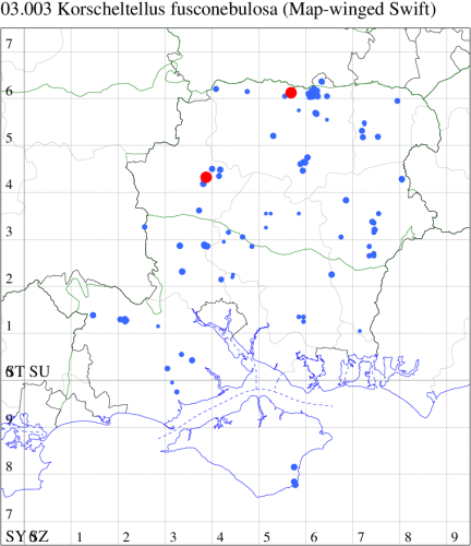 VC11: Earliest: East Tytherley, 27 Jul, 1 (GCE) Latest: Titchfield Haven NNR, 13 Sep, 1 (F.M.G.) Max count: Brownwich Cliffs, Titchfield, 16 Aug, 14 (F.M.G.)