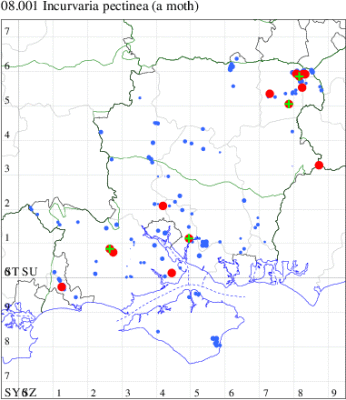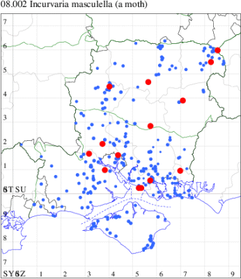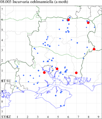 Local in scrub and heathland throughout much of Britain and Ireland. In Hampshire there are scattered records in the south and north-east of the county, notably at Botley Wood and at Fleet, but generally uncommon in the north of the county and on the Isle of Wight, although perhaps under-recorded since the extent of known records correlate with those areas in which the recording effort is concentrated. Wingspan 7-9 mm. Imago can be separated from other similar Incurvariidae by its small size, but often recorded in the larval stage, the mines of which are distinctive. Larva mines leaves of Birch, living within a movable case, subsequently feeding in the fallen leaves. The mines are described in the following link: