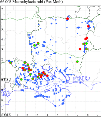 For the maps, all records prior to 2023 are shown by a blue dot (the larger the dot, the more recent), with the current year's records shown in red. As previous records are superimposed on any report for 2023, new sites have greater emphasis (i.e. will show as 'more red').