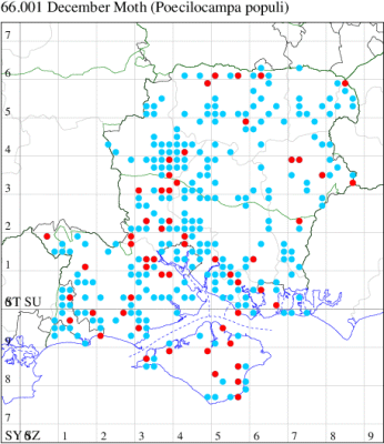 Common in woodland, scrub, hedgerows and gardens throughout much of the British Isles. In Hampshire and on the Isle of Wight widespread and common in wooded country in the three vice-counties, but doubtless still under-recorded because of the lateness of its flight period. Wingspan male 36-38 mm, female 42-48 mm. Unmistakable: no similar species fly so late in the year. Larva feeds on many deciduous tree species, including birch, oak, hawthorn and blackthorn.