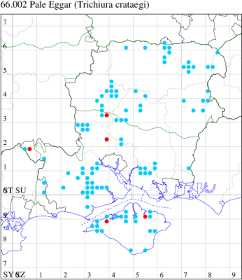 For the maps, all records prior to 2021 are shown by a blue dot (the larger the dot, the more recent), with the current year's records shown in red. As previous records are superimposed on any report for 2021, new sites have greater emphasis (i.e. will show as 'more red').