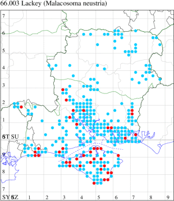 Common on heaths, gardens and open woodland in the southern half of England, Wales and Ireland, a species of conservation concern under the UK Biodiversity Action Plan. In Hampshire and on the Isle of Wight widespread and usually fairly common in the three vice-counties, the gregarious larvae still a familiar sight, though certainly much less so than 30 years ago. Wingspan male 32-36 mm, female 40-44 mm. Similar to Ground Lackey M. castrensis, which see for differences. Larva feeds on various broad-leaved trees and shrubs, including Hawthorn, Blackthorn, Plum, Apple and Cherry, living gregariously within a silken web, over-wintering as an egg.