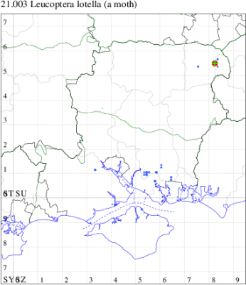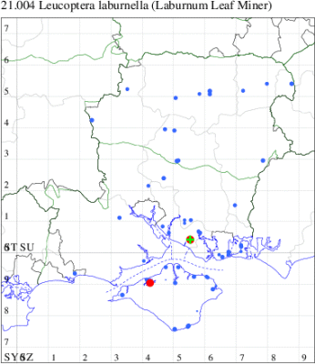 Common in gardens and urban areas throughout much of the British Isles, north to the Highlands of Scotland. In Hampshire widespread and often abundant in gardens in the vicinity of Laburnum, rather less common on the Isle of Wight. Form wailesella (Stainton 1857), previously considered a separate species, has been recorded, on Hayling Island in 1982. Wingspan 7-9 mm. Imago similar to L. spartifoliella; easily overlooked and not particularly common at light; more frequently recorded in the larval stage, when mines are relatively easy to find where they are present. Larva mines leaves of Laburnum, and also has been reported on Dyer's Greenweed; over-winters as a pupa.