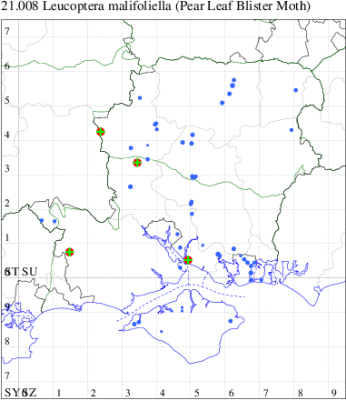 Common, appearing in profusion in hot summers, in hedgerows, orchards and gardens throughout much of England, Wales and southern Scotland; otherwise, rather scarce. In Hampshire irregularly distributed in the south-east and north-west; on the Isle of Wight mainly restricted to the north coast. Wingspan 7-8 mm. Most records are of the larval mines, but occasionally recorded at light, the main confusion species being L. lotella, but forewing of L. malifoliella broader, with no purple-black apical spot, and third cilial bar directed more or less outwards (MBGBI Vol 2). Larva mines leaves of Hawthorn, Apple and Pear, causing sufficient damage to be a serious pest in some years, and over-wintering as a pupa.