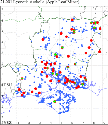 For the maps, all records prior to 2023 are shown by a blue dot (the larger the dot, the more recent), with the current year's records shown in red. As previous records are superimposed on any report for 2023, new sites have greater emphasis (i.e. will show as 'more red').