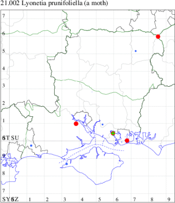 Formerly reported from the Midlands at Boughton, Worcestershire, Whittlebury Forest, Northamptonshire and near Stony Stratford, Buckinghamshire, and also from Worthing, Sussex, and it was fairly common in the late 19th Century (MBGBI Vol 2), it was not seen in the 1900's and was assumed to have become extinct. The first recent record appears to be in 2007, since when it has been encountered with increasing frequency in a number of counties including Dorset and Norfolk, perhaps following re-colonisation from the continent; the first Hampshire record was in 2014, since when it has been encountered with increasing regularity on the coast of Hampshire from Portsmouth to Hayling and on the south-eastern side of the Isle of Wight. The first North Hampshire record came in 2021, with another in 2023, and it will likely become more frequent inland. Wingspan 9-10 mm. The larva mines the leaves of various roseaceous trees, such as Blackthorn and apple, forming a gallery leading to a blotch. The pupal cocoon is suspended from silken 'guyropes' and closely resembles that of L. clerkella.