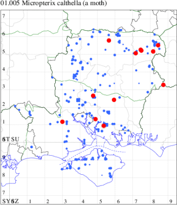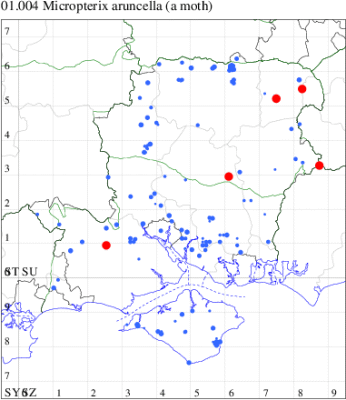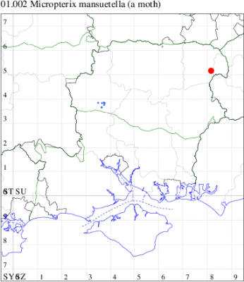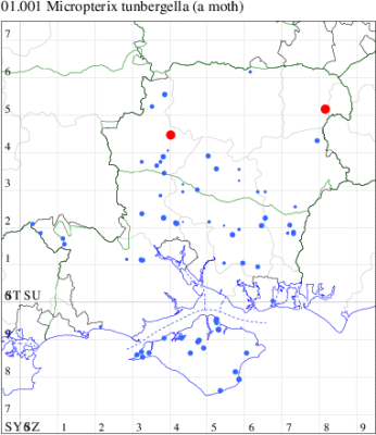 Common throughout the British Isles, excluding Orkney and Shetland, in generally dry habitats such as downland and hillsides (unlike its congeners which are mainly woodland species), feeding on the pollen of many herbaceous plants and hawthorn. Fairly widespread and common in Hampshire and on the Isle of Wight. Wingspan 6-8 mm. Fairly unmistakable. Larva feeds on various liverworts and detritus.