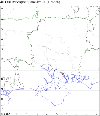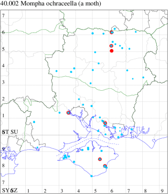 Common in damp areas throughout much of Britain, south of the Moray Firth. In Hampshire and on the Isle of Wight usually recorded in small numbers in most years, with apparent population centres in the south-east and around Basingstoke. Wingspan 14-16 mm. The only wholly yellow-ochreous Mompha. Larva mines stems and leaves of Great Willowherb.
