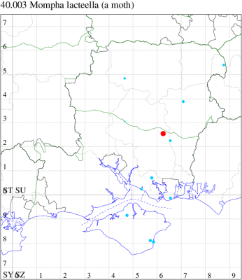 Local in open woodland, waste ground and gardens throughout Britain, north to Aberdeenshire. In Hampshire recorded widely in both vice-counties, but there are no recent records from the Isle of Wight. Wingspan 11-12.5 mm. The main confusion species is M. lacteella from which it is distinguished by the white head and thorax and on the forewing by the white basal blotch and brown terminal area (MBGBI Vol 4 part 1). Larva mines leaves of Broad-leaved Willowherb and Great Willowherb, over-wintering as a small larva.