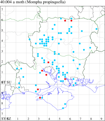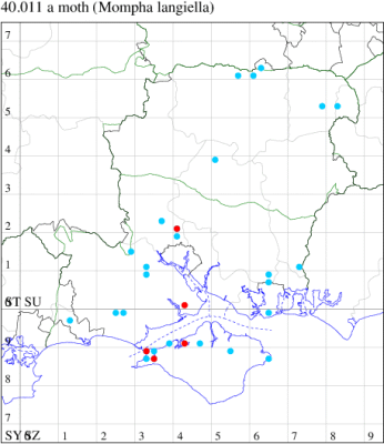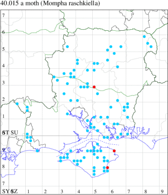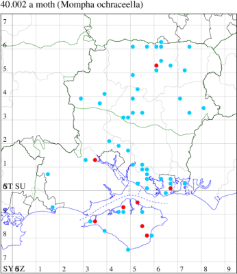 Common in damp areas throughout much of Britain, south of the Moray Firth. In Hampshire and on the Isle of Wight usually recorded in small numbers in most years, with apparent population centres in the south-east and around Basingstoke. Wingspan 14-16 mm. The only wholly yellow-ochreous Mompha. Larva mines stems and leaves of Great Willowherb.