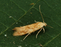 Common in damp areas throughout much of Britain, south of the Moray Firth. In Hampshire and on the Isle of Wight usually recorded in small numbers in most years, with apparent population centres in the south-east and around Basingstoke. Wingspan 14-16 mm. The only wholly yellow-ochreous Mompha. Larva mines stems and leaves of Great Willowherb.