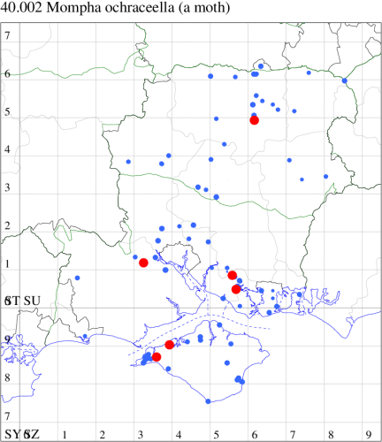 Common in damp areas throughout much of Britain, south of the Moray Firth. In Hampshire and on the Isle of Wight usually recorded in small numbers in most years, with apparent population centres in the south-east and around Basingstoke. Wingspan 14-16 mm. The only wholly yellow-ochreous Mompha. Larva mines stems and leaves of Great Willowherb.