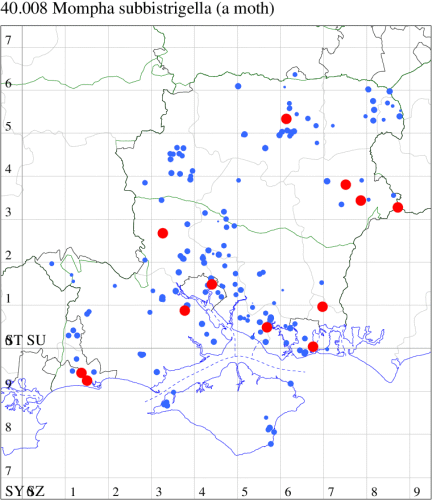 VC11: Fishlake Meadows, Romsey, two, field obs., 05 May (DAS); Netley, one, field obs., 09 Feb (ARC); Bevois Valley, Southampton, one, field obs., 03 May (MCrei); Sholing, one, 09 Feb (ARC); Itchen Valley C.P., one, 19 Jul (F.M.G.); Winchester, present, field obs., 18 May (JOug); Funtley, one, 01 Jul; one, 19 Jul (TDC); Fareham, one, 24 Jun (ADT); one, 02 Jul; two, 11 Jul; one, 17 Jul (IMcP); Milton Common, larval feeding signs, present, field obs., multiple spinnings on hoary willowherb. At least one had a larva, 02 Jul (IRT); two, field obs., tapped from hoary willowherb, 02 Jul (RJD); Portsmouth, one, 12 Apr; one, 07 May; one, 09 May; one, 14 Jul; one, 16 Jul (IRT); St Clair's Meadow NR, Droxford, larval spinning, present, field obs., large numbers of spun shoots on Epilobium hirsutum, larvae found in two, 03 Jun (RJD); Pennington, one, 19 Mar (RFC);