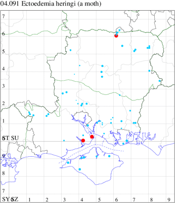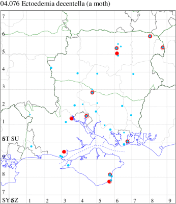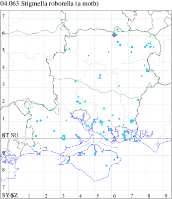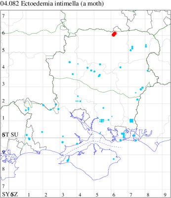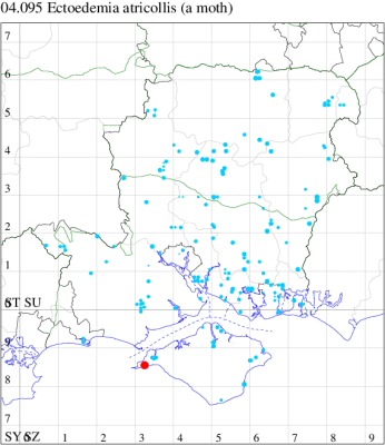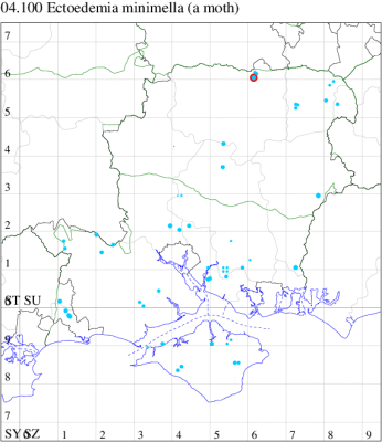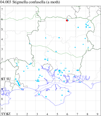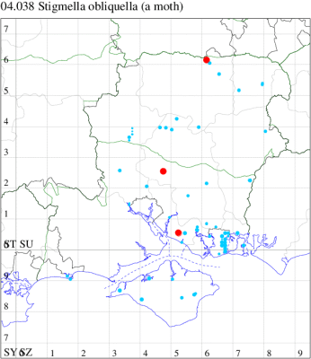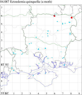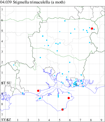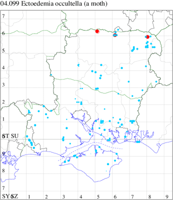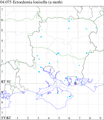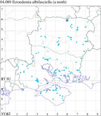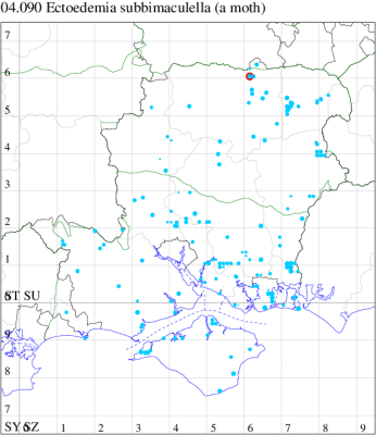 Local in woodland throughout south-eastern England. In Hampshire widely, but thinly, distributed across most of the county, but remaining extremely rare on the Isle of Wight. Wingspan male 4.2-5.0 mm, female 4.6-5.6 mm. Easily separated from all other Ectoedemia species by characteristic pattern of three white spots on forewing: a costal, a dorsal and a discal spot (MBGBI Vol 1). Larva mines leaves of Pedunculate Oak, often in fallen leaves, over-wintering as a pupa.