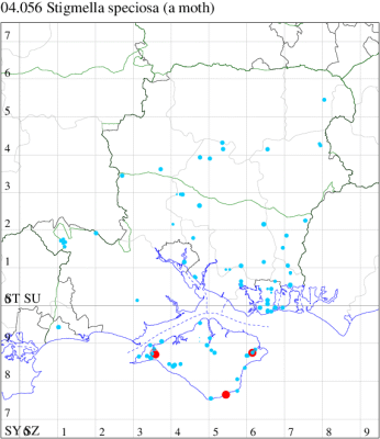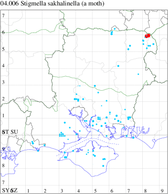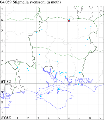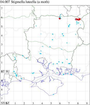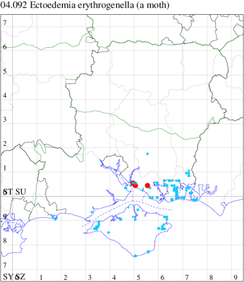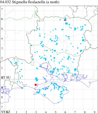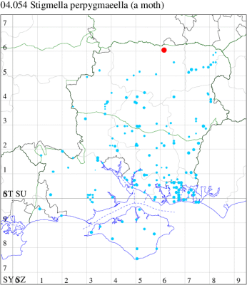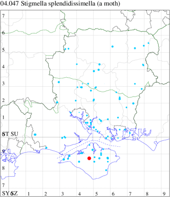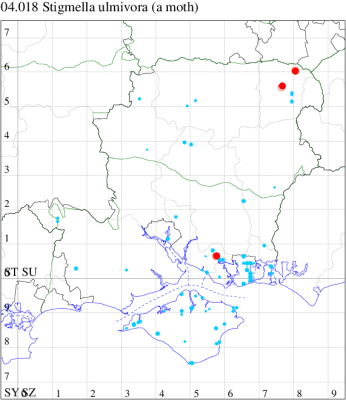 Local throughout much of England, as far north as Durham. In Hampshire very rare away from the extreme south-east of the county; on the Isle of Wight, common and widespread. Wingspan 4.8-5.6 mm. Larva mines leaves of Elm, over-wintering as a pupa.