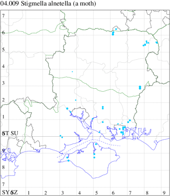 Local in southern and central Britain, in damp woodland and marshes, and on river-banks. In Hampshire and on the Isle of Wight thinly scattered in the south of the county and on the Island, but very rare in the north of the county. Adults difficult to distinguish from other Stigmella species, and more frequently recorded in the larval stage, when mines are relatively easy to find where they are present. Wingspan 3.9-4.8 mm. Larva mines leaves of Alder, over-wintering as a pupa. The mines, which are similar to those of S. glutinosae, are described in the following link: