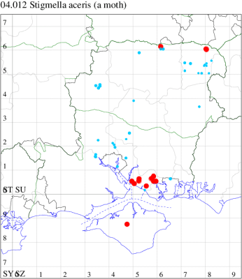 Local in woodland, gardens and parkland from Kent to Hampshire. First recorded in our area from Teg Down, Winchester, in 1986, it was not found again until 2004 in the Fleet area, where the centre of population in north Hampshire still lies. The last decade has seen an increase in records and it is now frequently recorded around the Southampton area; first recorded from the Isle of Wight in 2020, where further expansion is likely. Wingspan 3.7-4.7 mm. Best recorded in the larval stage, when mines can be found in the leaves of Field Maple, sometimes Norway Maple, over-wintering as a pupa. The mines are described in the following link: