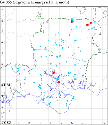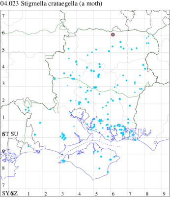 Common throughout much of the British Isles. In Hampshire and on the Isle of Wight mines are common on hawthorn in all three vice-counties. Wingspan 3.6-4.5 mm. The larva mines the leaves of Hawthorn, and are often common in hedgerows and woodland where this grows. The mines are described in the following link:
