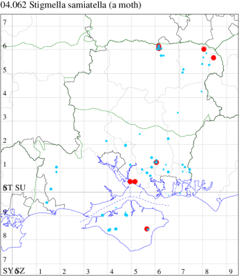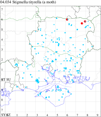 Common throughout much of Britain and western Ireland. In Hampshire and on the Isle of Wight mines are fairly common in all three vice-counties, notably at Botley Wood and Royston Woods HWT reserve in the south and around Fleet in the north. Wingspan 5-7 mm. Adults require dissection to distinguish from other Stigmella species, and more reliably recorded in the larval stage, which mines leaves of Birch, over-wintering as a pupa. The mines are described in the following link: