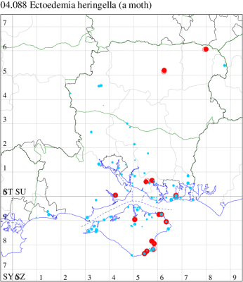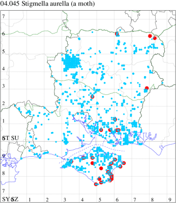 For the maps, all records prior to 2020 are shown by a blue dot (the larger the dot, the more recent), with the current year's records shown in red. As previous records are superimposed on any report for 2020, new sites have greater emphasis (i.e. will show as 'more red').