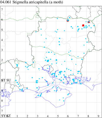 Common throughout much of the British Isles. In Hampshire and on the Isle of Wight widespread and common. The adult has a wingspan of 4.5-5.5 mm, with red- and black-headed forms co-exist, which were previously considered to be two distinct species. However, as adults are difficult to distinguish from other Stigmella species, it is best recorded in the larval stage, when mines can be found in the leaves of Hawthorn; occupied mines can be common in May and June and again between August and September. The mines are described in the following link: