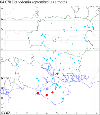 Common throughout much of England and Wales; rare in Ireland. Widespread in Hampshire and on the Isle of Wight, where reasonably common and probably under-recorded. Wingspan 4.9-6.2 mm. Very similar to Stigmella catharticella, but whereas the posterior legs in that species carry long hairs on the tibia and have dark spots on the tarsi, in Ectoedemia septembrella the tibia has shorter spines and the tarsi are unspotted (MBGBI Vol 1). Larva mines leaves of Perforate St John's-wort, over-wintering as a pupa.