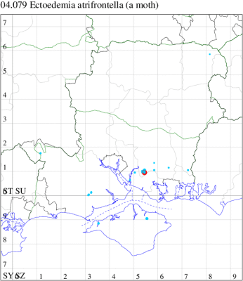 Common in hedgerows and orchards throughout much of England and Wales. Widely distributed and fairly common in Hampshire and on the Isle of Wight. Wingspan male 4.8-6.0 mm, female 5.2-6.2 mm. The imago is very similar to E. angulifasciella but in E. atricollis the ground colour is browner, the fascia is straighter and it is seldom noticeably extended towards the base along the costa and dorsum (MBGBI Vol 1). Adults difficult to distinguish from other Ectoedemia species, and more frequently recorded in the larval stage, when mines are relatively easy to find where they are present. Larva mines leaves of Hawthorn, Apple, Pear and Wild Cherry.