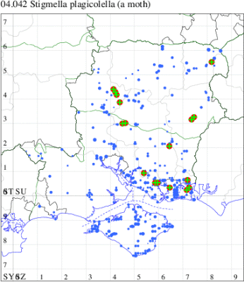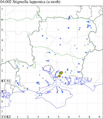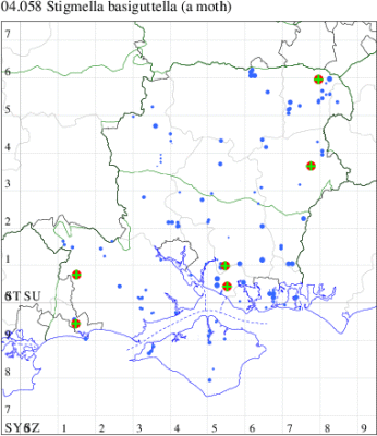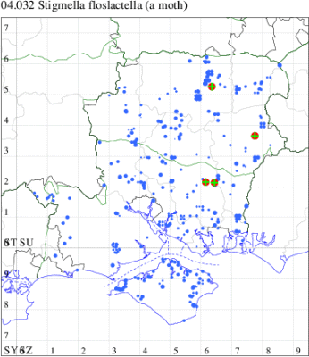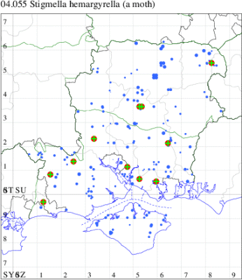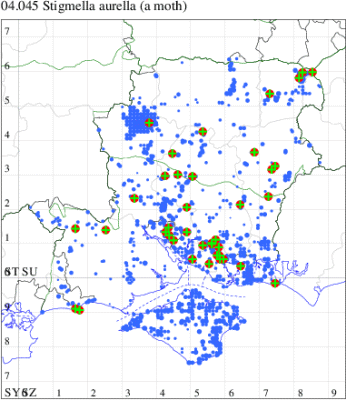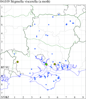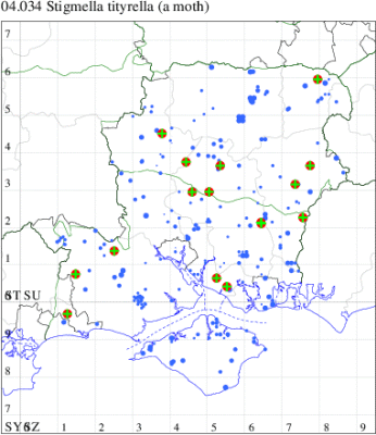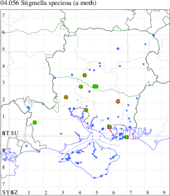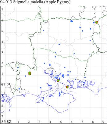 For the maps, all records prior to 2023 are shown by a blue dot (the larger the dot, the more recent), with the current year's records shown in red. As previous records are superimposed on any report for 2023, new sites have greater emphasis (i.e. will show as 'more red').