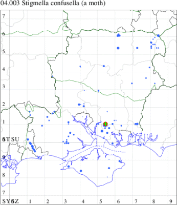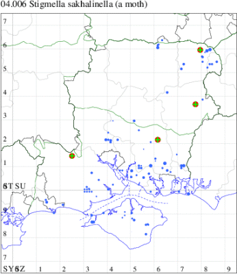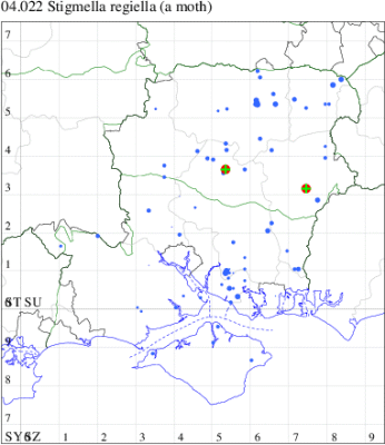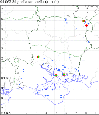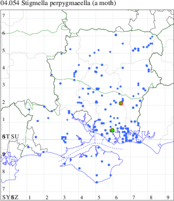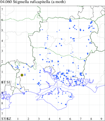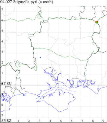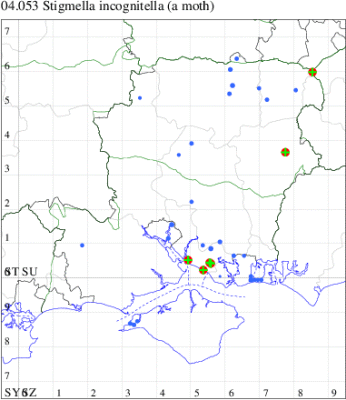 Local throughout much of England, rare elsewhere in Britain. Probably under-recorded in Hampshire and on the Isle of Wight, where the extent of known records correlate with those areas in which the recording effort is concentrated. Wingspan 4.5-5.5 mm. Adults difficult to distinguish from other Stigmella species, and more frequently recorded in the larval stage, when mines are relatively easy to find where they are present. Larva mines leaves of Apple, causing sufficient damage to be a serious pest in some areas, over-wintering as a pupa. The mines are described in the following link: