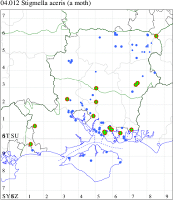 VC11: Funtley, one, gen det. , 09 Jun; one, female gen.det. , 11 Jun (TDC det. RJD); Fareham, mine, one, on Field Maple samara. , 29 Jun; Peel Common Sewage Works, nr Stubbington, one, on host-plant, mine on Field Maple samara., 29 Jun (DPH); Cams Bay, Fareham, mine, present, 24 Sep (AMD); Portchester, one, 09 Sep (DH-J);