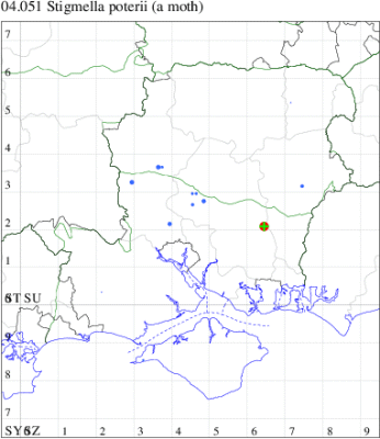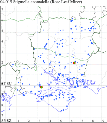 Common in hedgerows, parks and gardens throughout the British Isles. In Hampshire and on the Isle of Wight widespread and locally common, but doubtless under-recorded. Wingspan 5-6.5 mm. Imago has plain bronze forewing, tinged green on the inner two-thirds and red towards the tip (MBGBI Vol 1), but can be separated from similar Stigmella species only by dissection of the genitalia. Most frequently recorded as a larval miner of the leaves of Cultivated Rose and Wild Rose, over-wintering as a pupa. However, the mine very similar to that of S. centifoliella and records of vacated mines, although reported here, should be treated with caution.