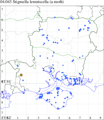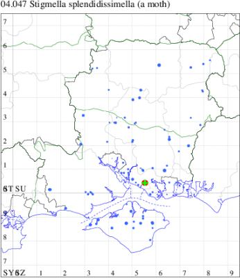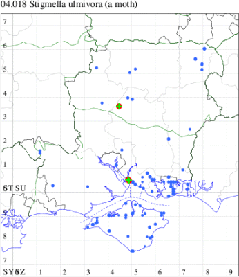 Local throughout much of England, as far north as Durham. In Hampshire very rare away from the extreme south-east of the county; on the Isle of Wight, common and widespread. Wingspan 4.8-5.6 mm. Larva mines leaves of Elm, over-wintering as a pupa.