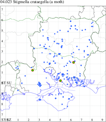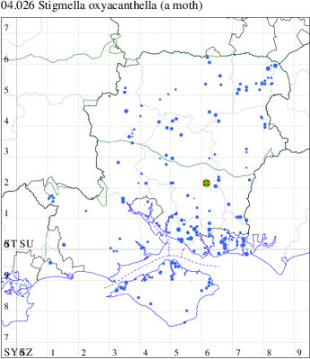 Local in hedgerows, scrub and gardens throughout much of England and Wales. Fairly widely distributed in Hampshire and on the Isle of Wight, with the characteristic leaf mine, a narrow gallery filled with reddish frass following the leaf-margin and then expanding abruptly into a blotch with the frass, now blackish, deposited irregularly in the centre (MBGBI Vol 1), often found wherever significant growths of the foodplant grow. The adult is only confirmable by dissection of the genitalia. The larva mines leaves of Hawthorn, over-wintering as a pupa.