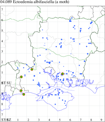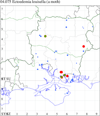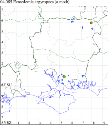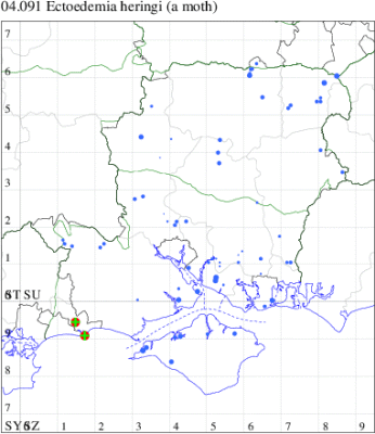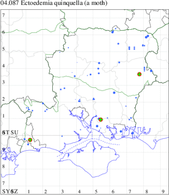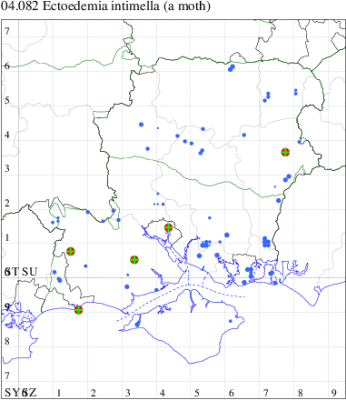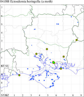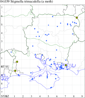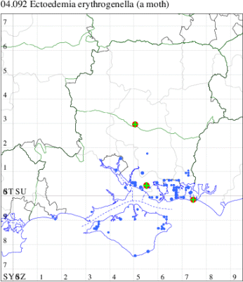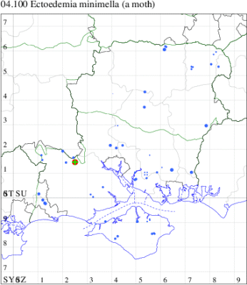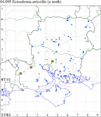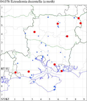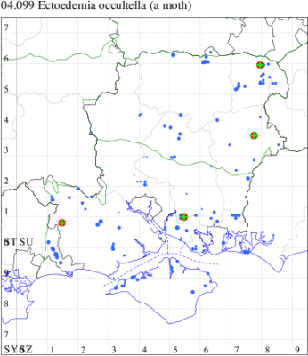 Local in woodland throughout south-eastern England. In Hampshire widely, but thinly, distributed across most of the county, but remaining extremely rare on the Isle of Wight. Wingspan male 4.2-5.0 mm, female 4.6-5.6 mm. Easily separated from all other Ectoedemia species by characteristic pattern of three white spots on forewing: a costal, a dorsal and a discal spot (MBGBI Vol 1). Larva mines leaves of Pedunculate Oak, often in fallen leaves, over-wintering as a pupa.