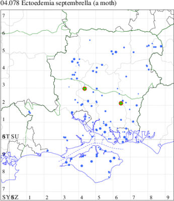 Common throughout much of England and Wales; rare in Ireland. Widespread in Hampshire and on the Isle of Wight, where reasonably common and probably under-recorded. Wingspan 4.9-6.2 mm. Very similar to Stigmella catharticella, but whereas the posterior legs in that species carry long hairs on the tibia and have dark spots on the tarsi, in Ectoedemia septembrella the tibia has shorter spines and the tarsi are unspotted (MBGBI Vol 1). Larva mines leaves of Perforate St John's-wort, over-wintering as a pupa.