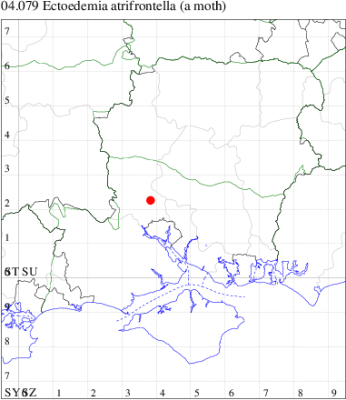 Common in hedgerows and orchards throughout much of England and Wales. Widely distributed and fairly common in Hampshire and on the Isle of Wight. Wingspan male 4.8-6.0 mm, female 5.2-6.2 mm. The imago is very similar to E. angulifasciella but in E. atricollis the ground colour is browner, the fascia is straighter and it is seldom noticeably extended towards the base along the costa and dorsum (MBGBI Vol 1). Adults difficult to distinguish from other Ectoedemia species, and more frequently recorded in the larval stage, when mines are relatively easy to find where they are present. Larva mines leaves of Hawthorn, Apple, Pear and Wild Cherry.
