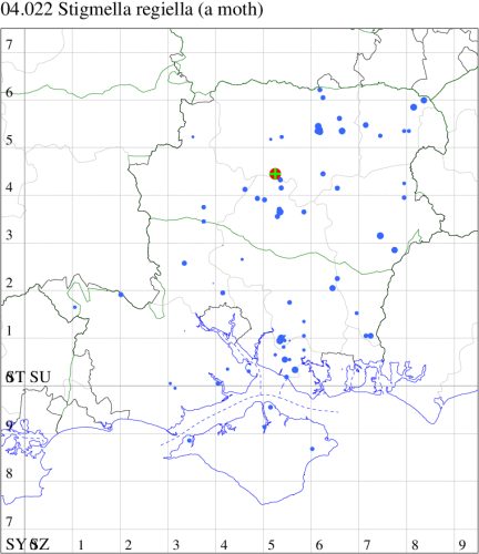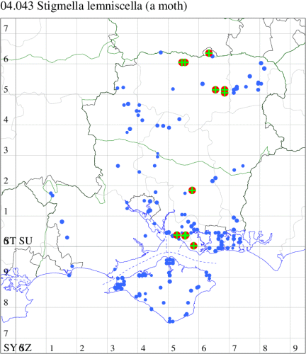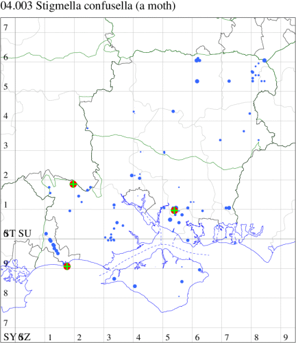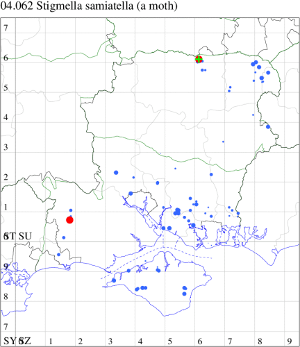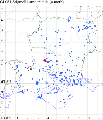Local in southern and central Britain. in damp woodland and marshes, and on river-banks. In Hampshire and on the Isle of Wight thinly scattered in the south of the county, such as at Roydon Woods HWT reserve, and on the Island, but very rare in the north of the county. Adults difficult to distinguish from other Stigmella species, and all records require gen det to be accepted. Wingspan 4.4-5.2 mm. Larva mines leaves of Alder, over-wintering as a pupa. The mines are similar to those of S. alnetella and are described in the following link: