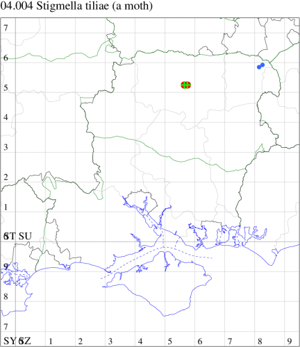 Local in woodland, in England and Wales, from Somerset to the Lake District, reasonably well distributed in East Anglia. The first Hampshire records were in the far north-east corner in the autumn of 2022; probably overlooked, and found further west in the Basingstoke area in 2024. Wingspan 4.5-6 mm. The moth is dark bronze brown with a golden sheen base and purple tip, a black head tuft and cream collar and scape, but dissection or breeding through of moth required for identification. Larva mines the leaves of lime (Tilia sp.), creating a long and contorted gallery from an ovum laid on the underside of a leaf. The mine is a contorted gallery filled with coiled frass. The larva is pale yellow, with a pale brown head, active in July, and September to October. See national distribution here in the NBN Atlas.