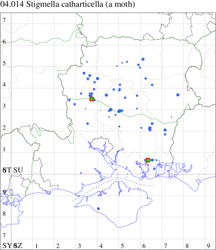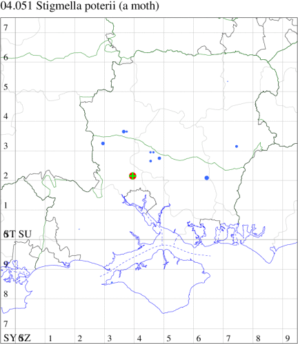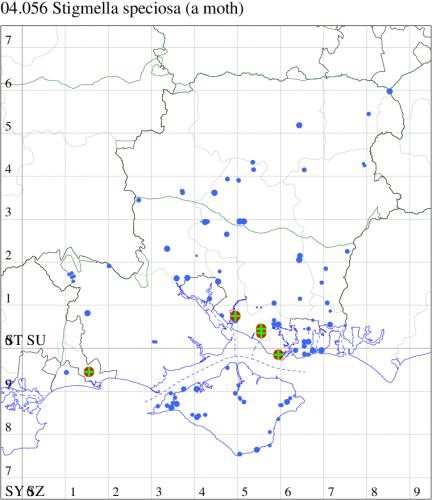 For the maps, all records prior to 2024 are shown by a blue dot (the larger the dot, the more recent), with the current year's records shown in red. As previous records are superimposed on any report for 2024, new sites have greater emphasis (i.e. will show as 'more red').