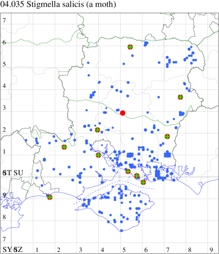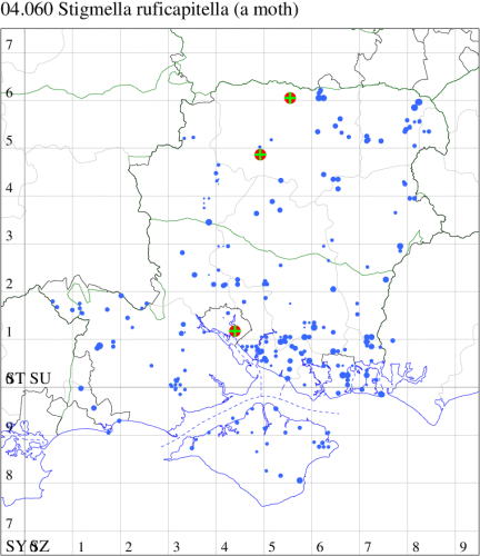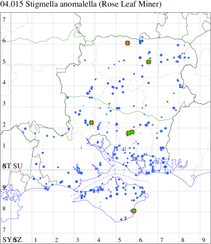 Common in hedgerows, parks and gardens throughout the British Isles. In Hampshire and on the Isle of Wight widespread and locally common, but doubtless under-recorded. Wingspan 5-6.5 mm. Imago has plain bronze forewing, tinged green on the inner two-thirds and red towards the tip (MBGBI Vol 1), but can be separated from similar Stigmella species only by dissection of the genitalia. Most frequently recorded as a larval miner of the leaves of Cultivated Rose and Wild Rose, over-wintering as a pupa. However, the mine very similar to that of S. centifoliella and records of vacated mines, although reported here, should be treated with caution.