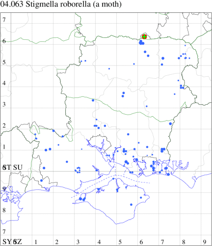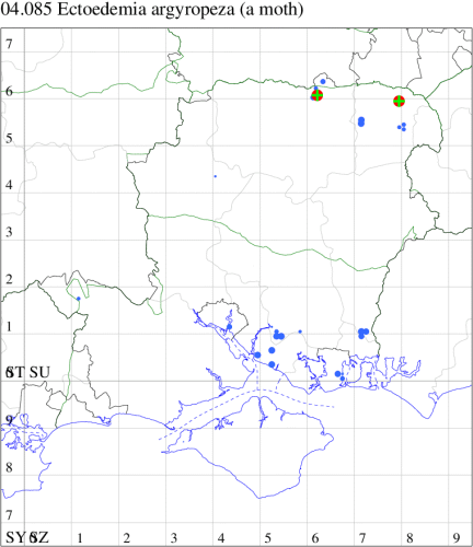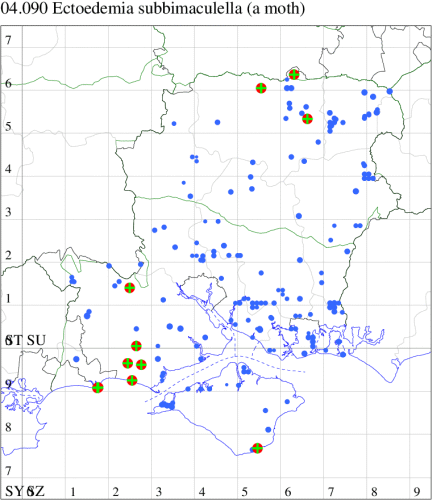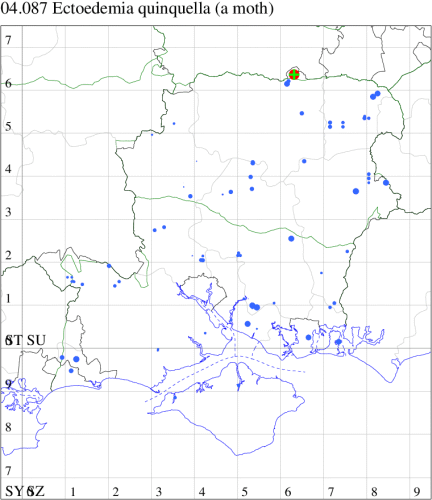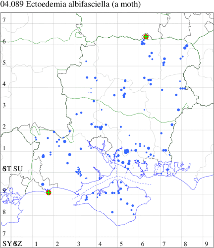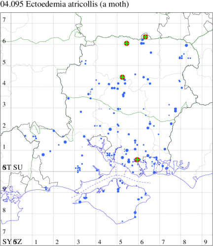 Local in woodland throughout south-eastern England. In Hampshire widely, but thinly, distributed across most of the county, but remaining extremely rare on the Isle of Wight. Wingspan male 4.2-5.0 mm, female 4.6-5.6 mm. Easily separated from all other Ectoedemia species by characteristic pattern of three white spots on forewing: a costal, a dorsal and a discal spot (MBGBI Vol 1). Larva mines leaves of Pedunculate Oak, often in fallen leaves, over-wintering as a pupa.