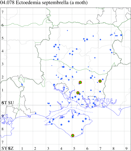 Common throughout much of England and Wales; rare in Ireland. Widespread in Hampshire and on the Isle of Wight, where reasonably common and probably under-recorded. Wingspan 4.9-6.2 mm. Very similar to Stigmella catharticella, but whereas the posterior legs in that species carry long hairs on the tibia and have dark spots on the tarsi, in Ectoedemia septembrella the tibia has shorter spines and the tarsi are unspotted (MBGBI Vol 1). Larva mines leaves of Perforate St John's-wort, over-wintering as a pupa.